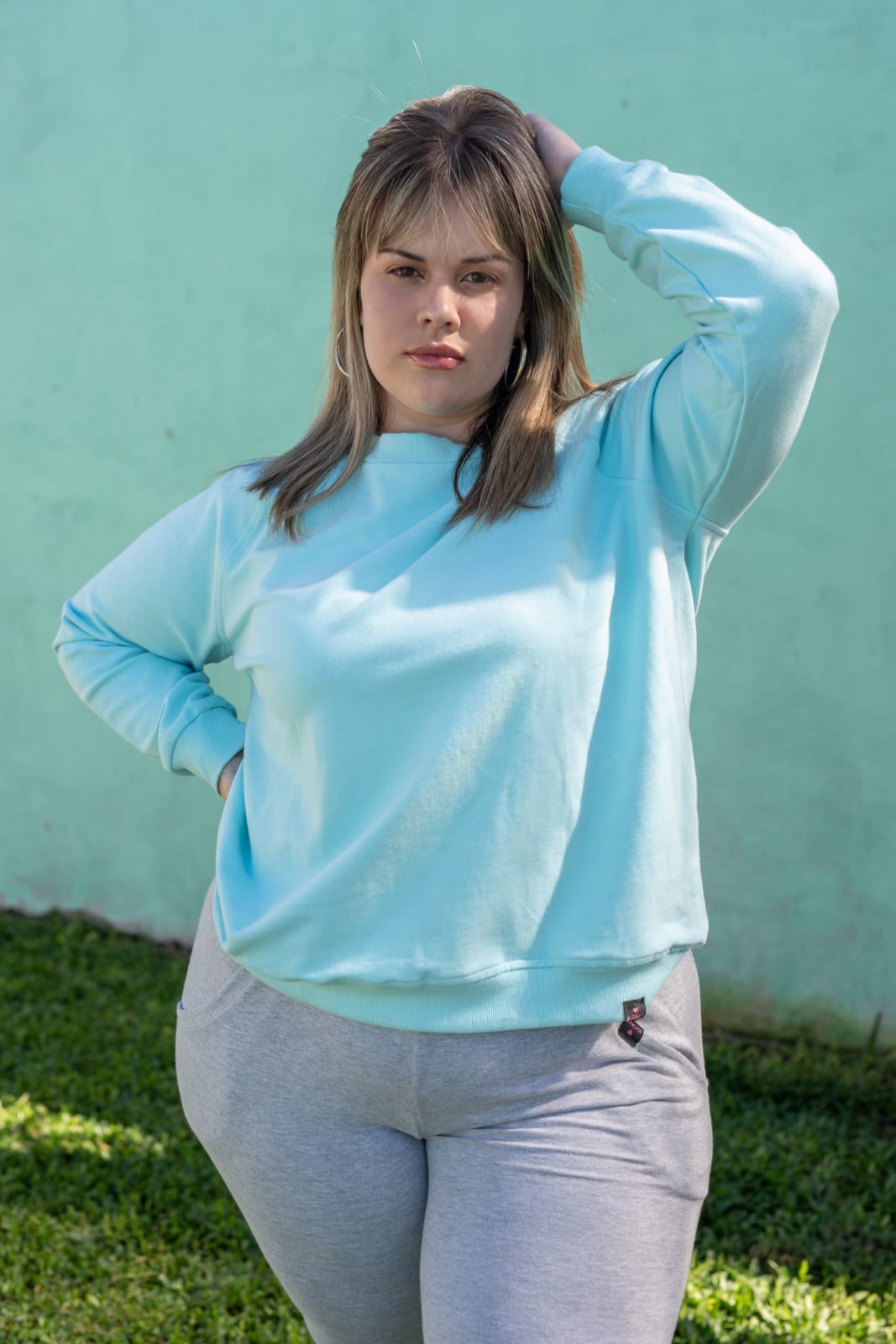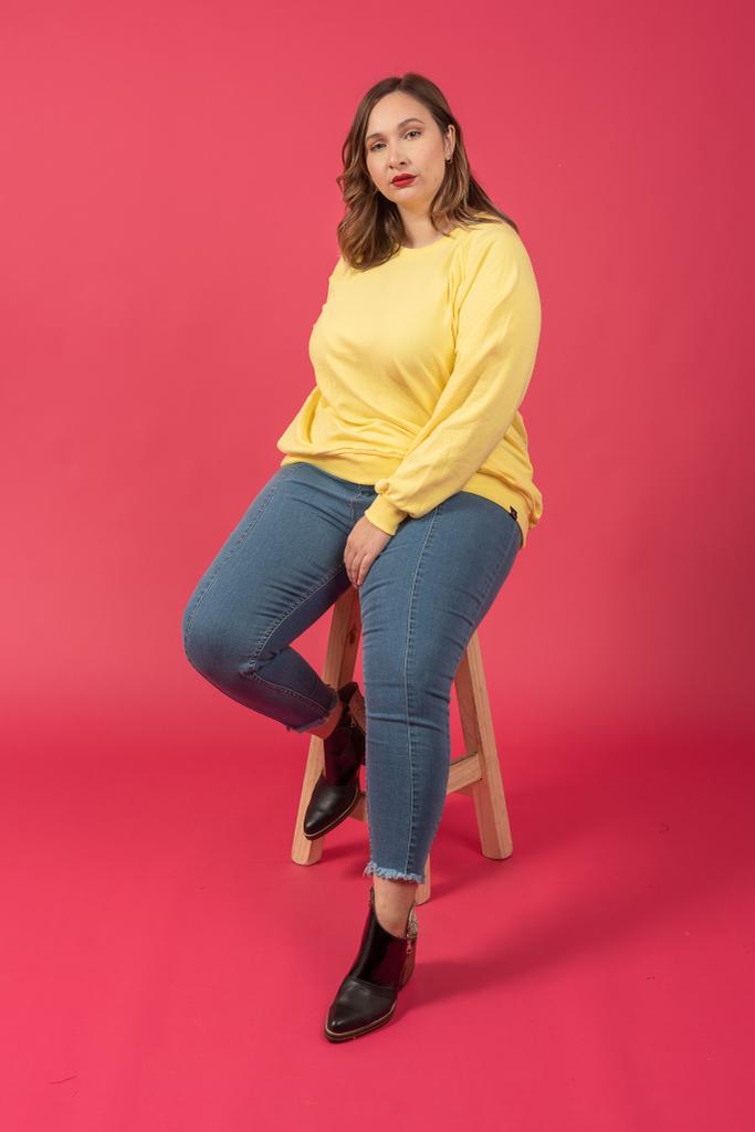 La modelo luce buzo deportivo color lila con cuello a la base. ¡Sumate a la tendencia de los tonos pastel y llevate tu preferido!