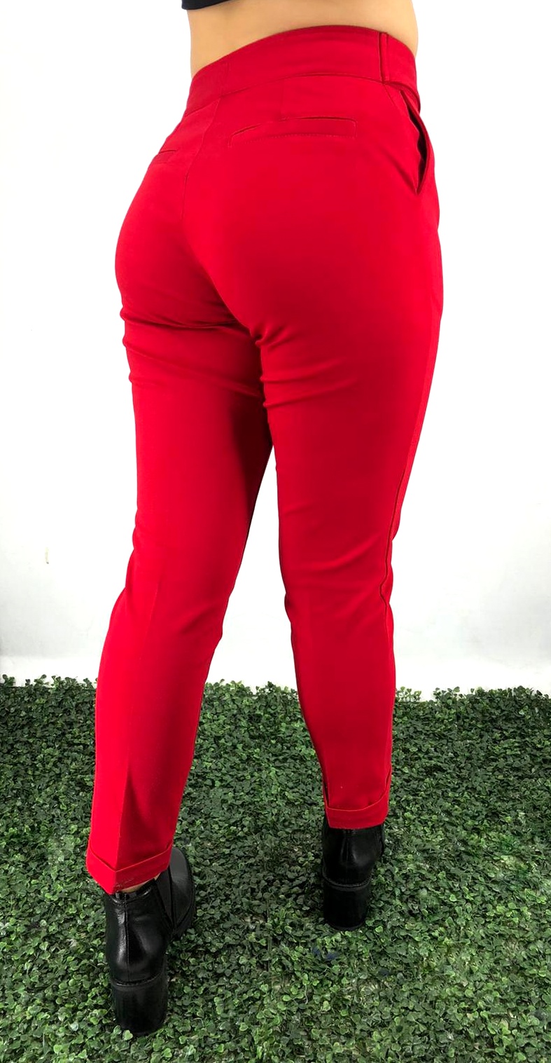 Pantalón tipo de vestir. Tiro alto, chupin y con detalle de hebilla en el cinto.